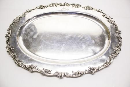 3361. Plateau ovale à bordure de feuilles d'eau, dédicacé "Le Conseil...