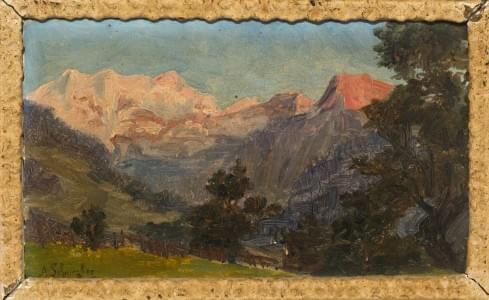 Montagnes au couchant, huile sur carton, signée,11x19 cm