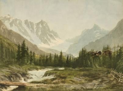 Vallon alpestre, aquarelle et gouache sur papier signée, 21,5x29...