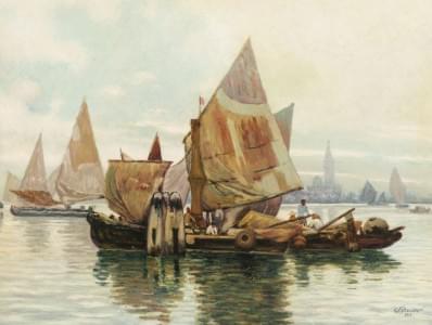 Bateaux de pêcheurs dans la lagune, huile sur carton, signée et...