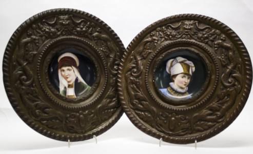 Cuivre repoussé et plaque de porcelaine émaillée polychrome à dé...