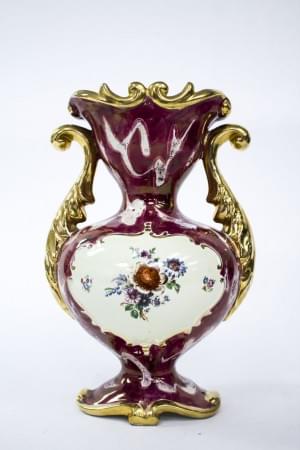 3650. Vase balustre à décor de fleurs dans un médaillon sur fond pourp...