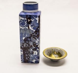 3683. Vase à section carrée japonisant bleu et coupelle à décor de poi...