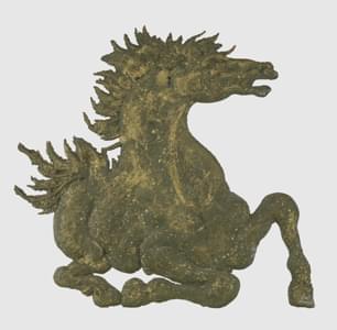 Cheval en bas-relief, aluminium à patine verte et or, signé et n...