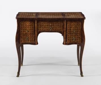 Plateau ouvrant à trois abattants, tiroirs en ceinture, marquete...