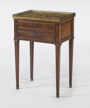Acajou, filet de bois noirci, deux tiroirs, marbre brèche d'Alep...