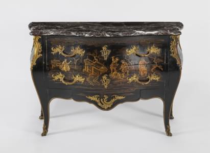 Bois laqué noir et or à motif de chinoiseries, deux tiroirs, bro...