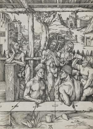 Le Bain des hommes, bois. Belle épreuve un peu usée, mouillures,...