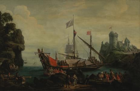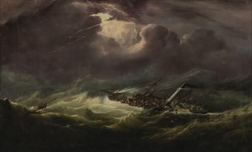 Scène de naufrage, huile sur toile, signée et datée 1832, 66x110...