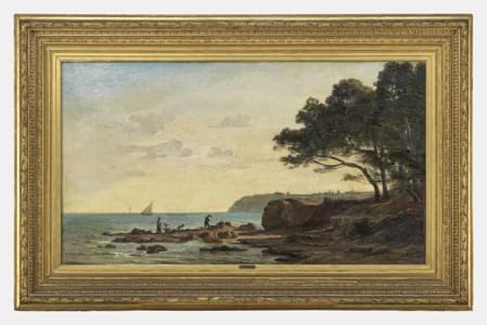 Pêcheurs au bord de la mer, huile sur toile, signée, 84x150 cm