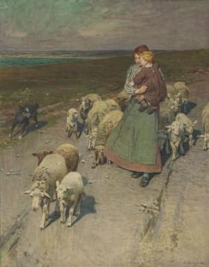 Bergère et son troupeau, huile sur toile, 89x69 cm
