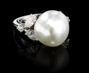 305. Bague centrée d'une perle (D env. 9 mm) entourée de diamants (en...