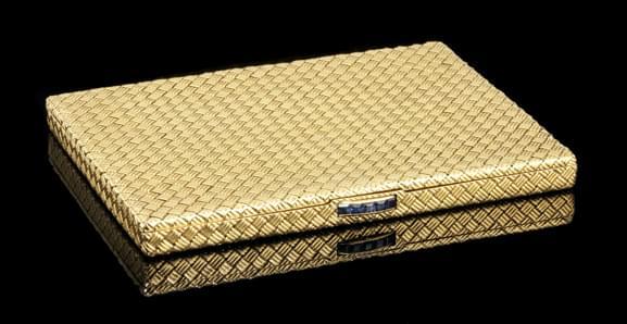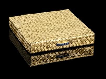 369. Boîte à cigarettes à décor de vannerie avec poussoir serti d'une...