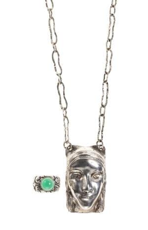 Le collier retenant un pendentif rectangulaire repoussé d'un vis...