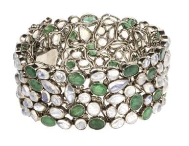 Pavé d'émeraudes taille ovale et de pierres de Lune taille caboc...
