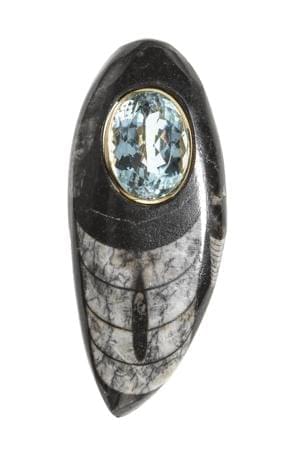 3963. Broche composée d'un fossile d'orthocéras centré d'une topaze bl...