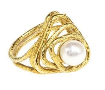 3980. Bague stylisée ajourée triangulaire centrée d'une perle (D env....