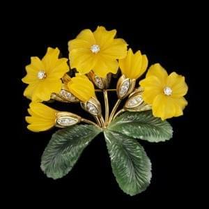 4102. Broche à motif de bouquet de primevères en pierres dures sculpté...