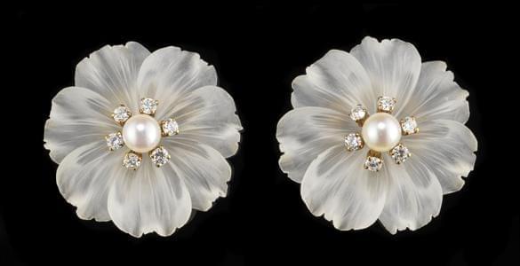 4105. Clips d'oreilles à motif de fleurs blanches en pierres dures scu...