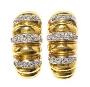 4113. Clips d'oreilles demi-créoles bicolores à motifs godronnés serti...
