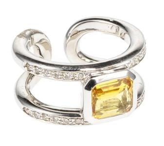 4139. Bague design ajourée sertie d'un saphir jaune taille émeraude (e...
