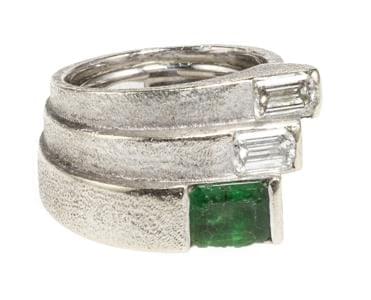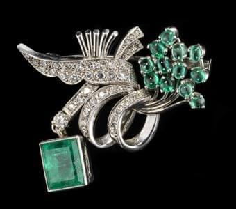 4186. Broche stylisée pavée de diamants, rehaussée d'un bouquet d'émer...