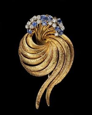 4157. Broche stylisée rehaussée d'un bouquet de diamants et de saphirs...