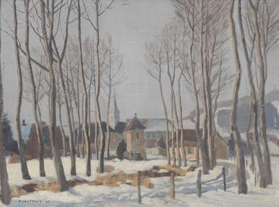 Paysage de neige, huile sur panneau, signée et datée 42, 46x61 c...