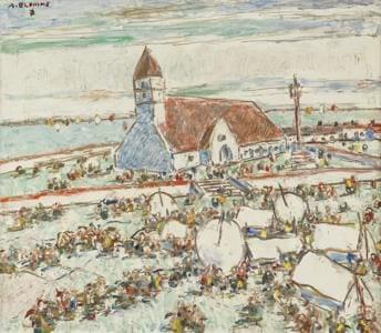 Marché de village devant l'église, huile sur pavatex, signée, 79...