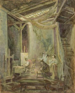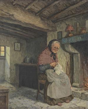 Grand-mère brodant près de la cheminée, huile sur panneau, signa...