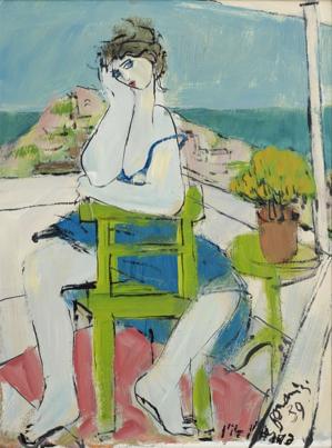 Jeune femme en bord de mer, huile sur toile, signée, 46x38 cm