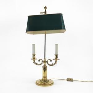 Bronze à patine brune, abat-jour vert, H 27 cm