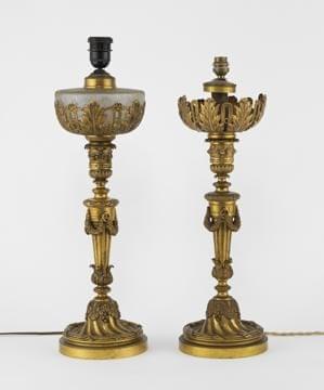 3450. Paire de flambeaux d'époque Restauration, montés en lampe