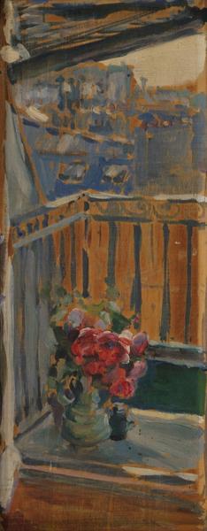 Balcon sur les toits de la ville, huile sur bois, 26x10 cm. Prov...
