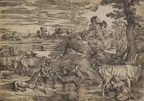 Scène pastorale, estampe d'après une composition du Titien, 37x5...