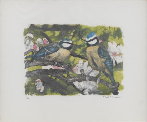 Chardonnerets, bois gravé, signé et numéroté 52/64, 46x55 cm