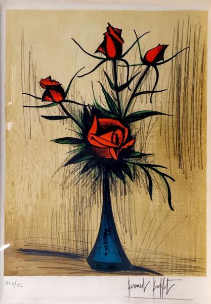 Vase de roses rouges, lithographie, signée et numérotée 123/150,...