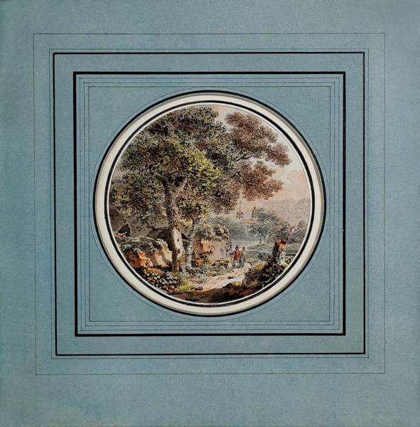 Chemin animé de personnages, aquarelle en tondeau, D 15 cm