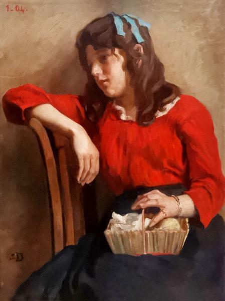 Jeune fille en chemise rouge, huile sur carton, 66x50 cm