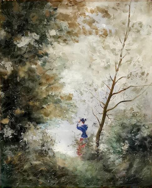Elégante perdue dans la forêt, huile sur toile signée Vitelet, 4...