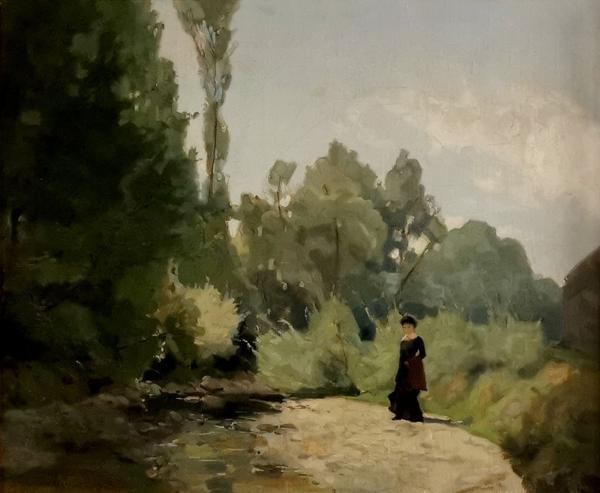 Jeune femme au bord de l'Aïre à Onex, huile sur carton, 37x46 cm
