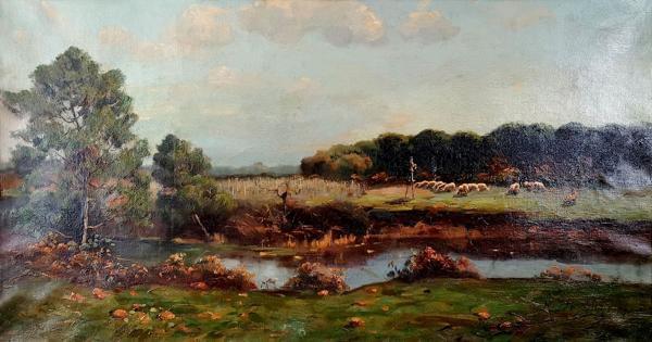 Berger des Landes près de la mare, huile sur toile, signée, 35x6...