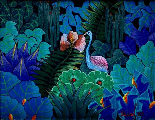 Paysage avec des flamands roses, huile sur toile, signée, 51x61...