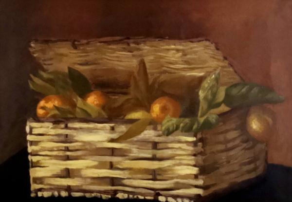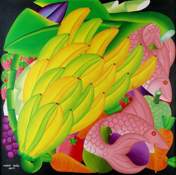 Fruits et poisson, huile sur toile, signée, 83x70 cm