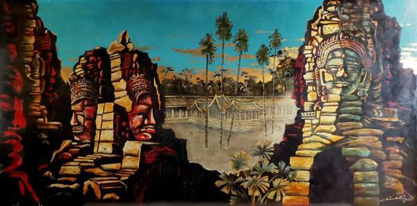 Paysage avec ruines, panneau en bois laqué et peint, signature i...
