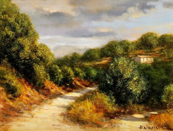Femmes sur un chemin, huile sur toile signée, 61x40 cm