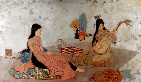 La cérémonie du thé, laque sur bois, signée et datée 70, 100x60...