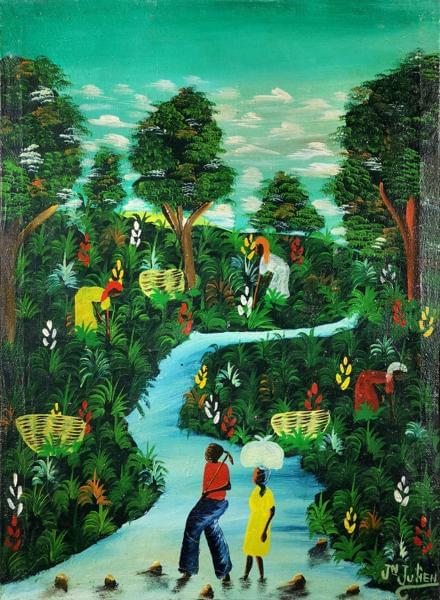 Couple traversant la rivière et femmes aux champs, huile sur toi...