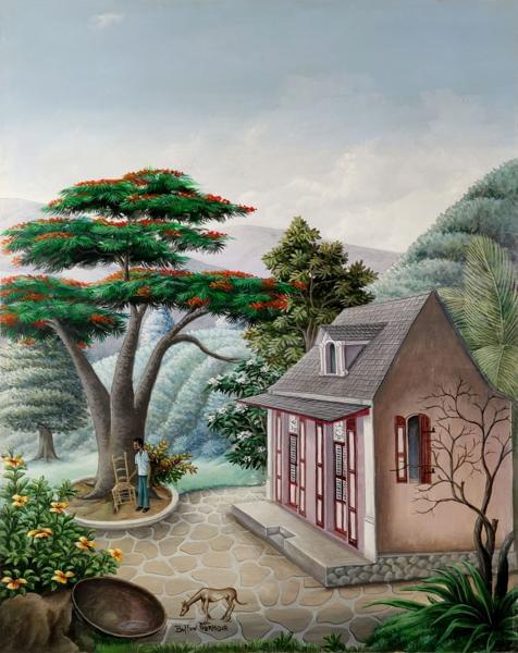 Homme sur la terrasse de sa case, huile sur toile, signée, 50x40...