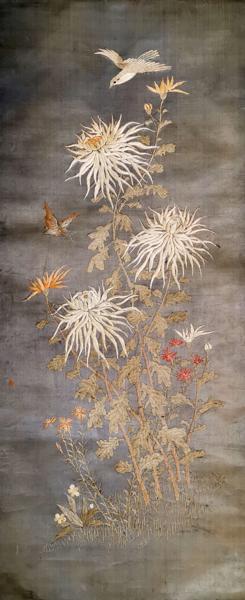 Oiseaux et fleurs, tapisserie sur soie, montée en rouleau, 131x5...